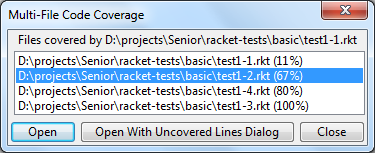 You may then select one, or more, of the covered files to open and switch focus to. Additionally, by clicking the "Open With Uncovered Lines Dialog", instead of just "Open", each selected file will spawn the Uncovered Lines Dialog with a list of lines containing unevaluated expressions.