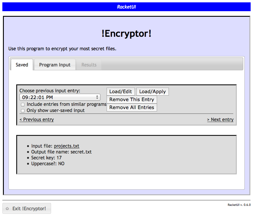 With every function application, or when the user clicks the "Save current input" button in the program input tab, RacketUI saves a snapshot of the user’s input, including any uploaded files. This makes it easier to recall, modify, and re-apply input without having to enter it all over again. Saved input is preserved even when the application is terminated.