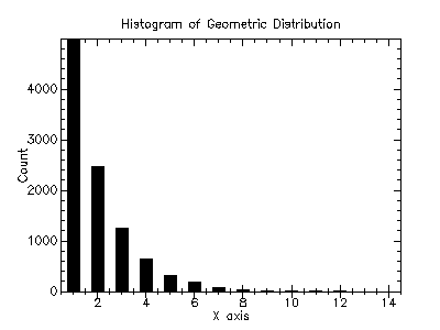 Example: Histogram of random variates from the geometric distribution with probability 0.5.
