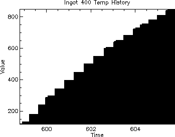 If you look at the output of Model 2 above, you will notice a distinct stairstep pattern in the temperature history of the ingots. You will also notice that it overshoots the maximum temperature as much as 20 degrees. This is due to the nature of the near linear temperature function in conjunction with the default control strategy used by the integration loop. The default control strategy will dynamically adjust the step size while keeping the error estimate within an acceptable limit (by default this is 10-6). Unfortunately, this does work well in this case.